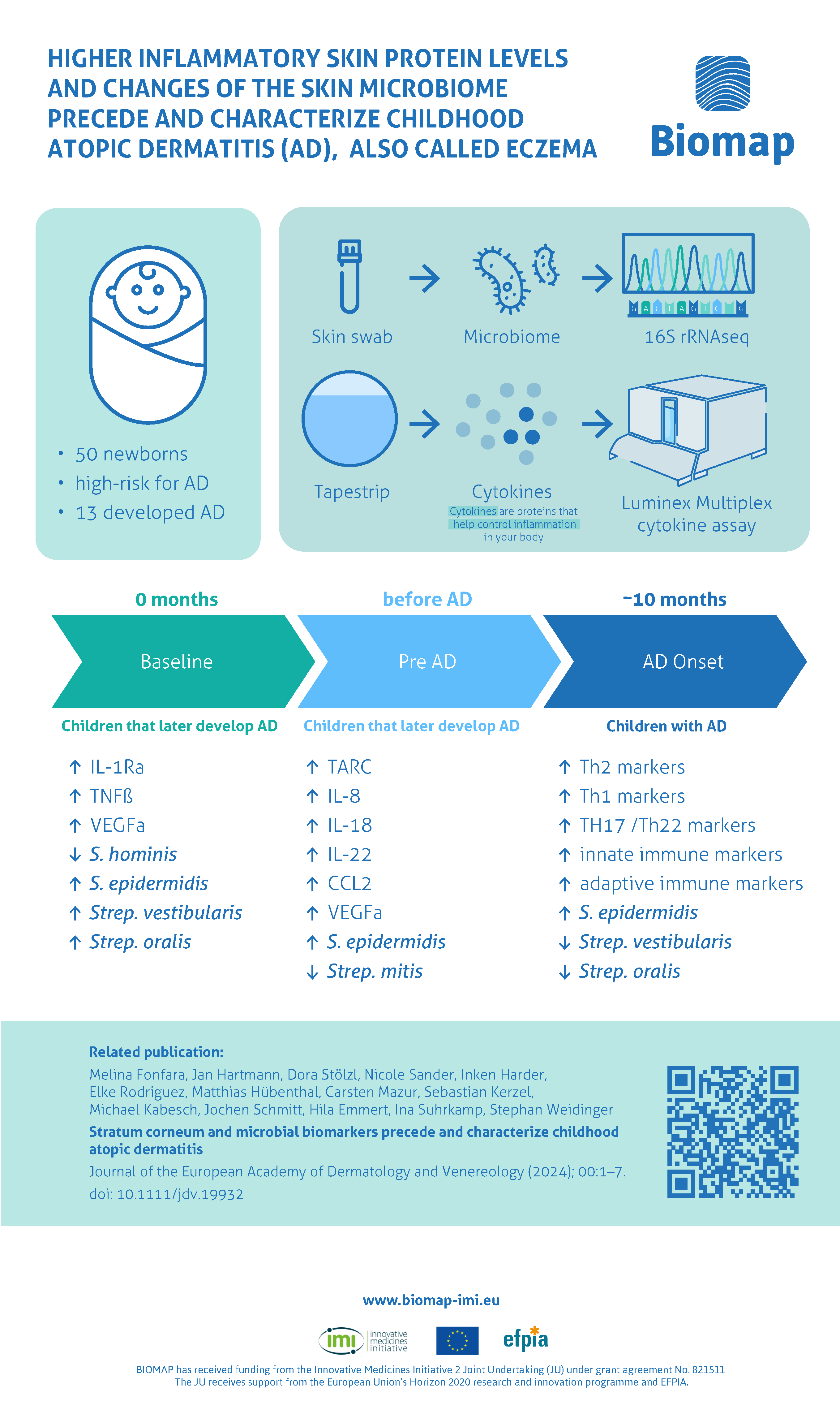 13 of these infants developed AD until month 24 with children being an average age of 10 months when AD began. In these 13 children, levels of multiple important inflammatory skin proteins (IL-1Ra, TNFβ, IL-8, IL-18, IL-22, CCL2, TARC, TSLP and VEGFa) increased even before AD occurred. Levels of some of these proteins (IL-1Ra, TNFβ and VEGFa) already increased shortly after birth. Further, these children displayed a delayed maturation and differentially composed skin microbiome prior to AD onset compared to children that never developed AD. When AD occurred, we found that levels of important skin proteins were again higher, and many healthy skin bacteria (i.e. multiple Streptococcus species) were reduced, whereas the potentially harmful Staphylococcus epidermidis was increased.