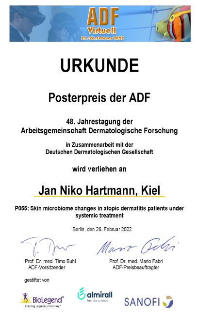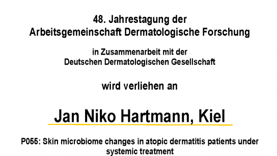 Jan Hartmann from CAU (Christian-Albrechts-Universität zu Kiel) has received one of the eight poster awards at this year‘s ADF annual meeting for his poster: "Skin microbiome changes in atopic dermatitis patients under systemic treatment".