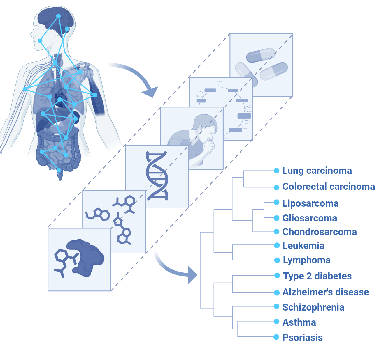 Traditionally, diseases are classified based on the organs or tissues they most noticeably affect. For example, we distinguish between "skin" and "gut" diseases. However, research has revealed similarities between diseases that seem to have nothing in common. Many people today are affected by more than one disease. Understanding the connections and processes between these diseases, can help to develop new therapies or decide the best existing treatment for each individual patient. For example, understanding the link between diabetes and heart disease can help doctors identify patients at high risk and develop targeted treatments.