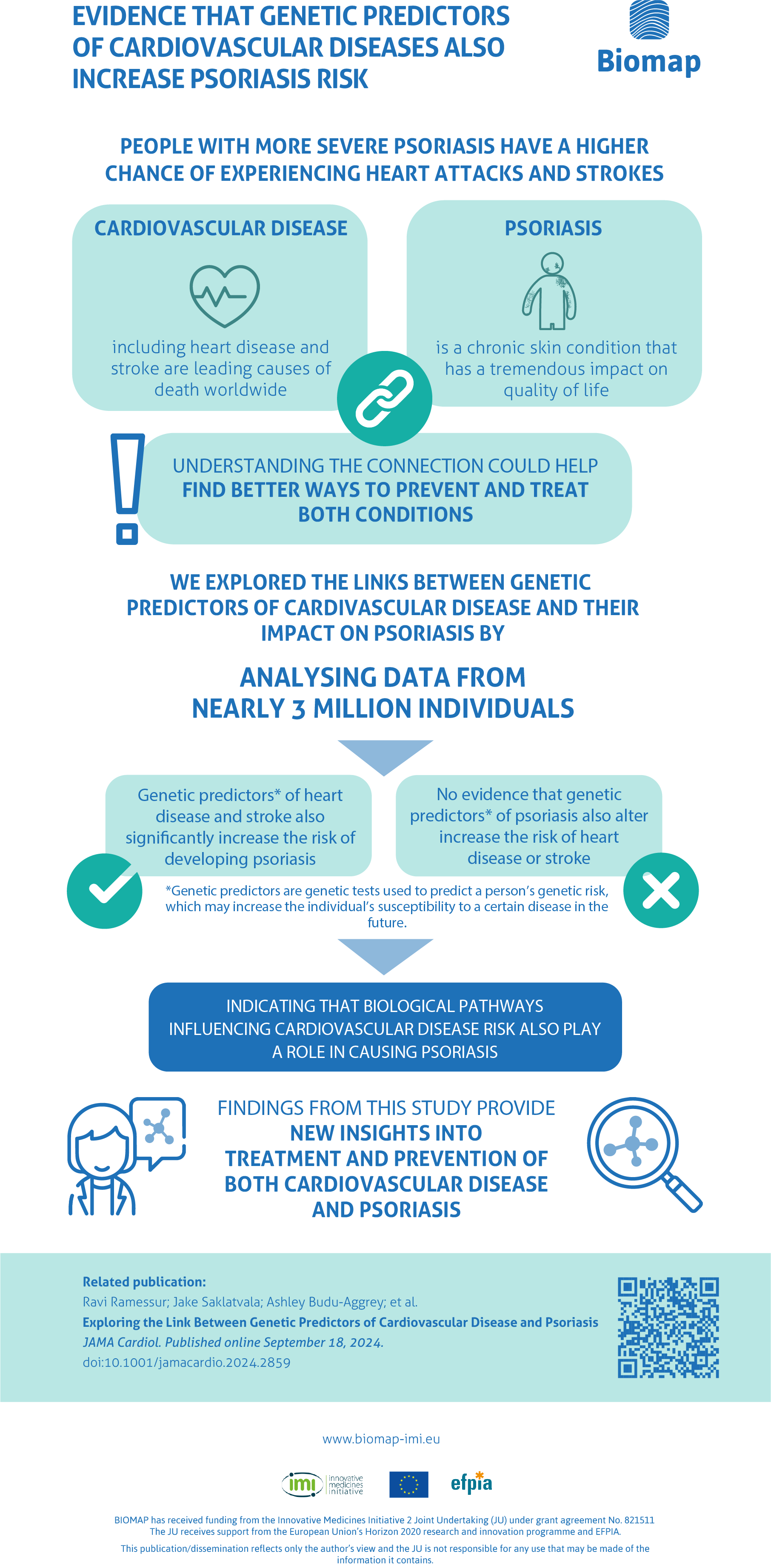 Our recent study explores the link between genetic predictors of cardiovascular diseases and their connection to psoriasis, a chronic skin condition. Cardiovascular diseases, such as coronary heart disease and stroke, are leading causes of death worldwide. Psoriasis impacts the quality of life significantly due to its symptoms, visual appearance and chronic nature. Understanding how these conditions are connected can help in the development of better prevention and treatment strategies.