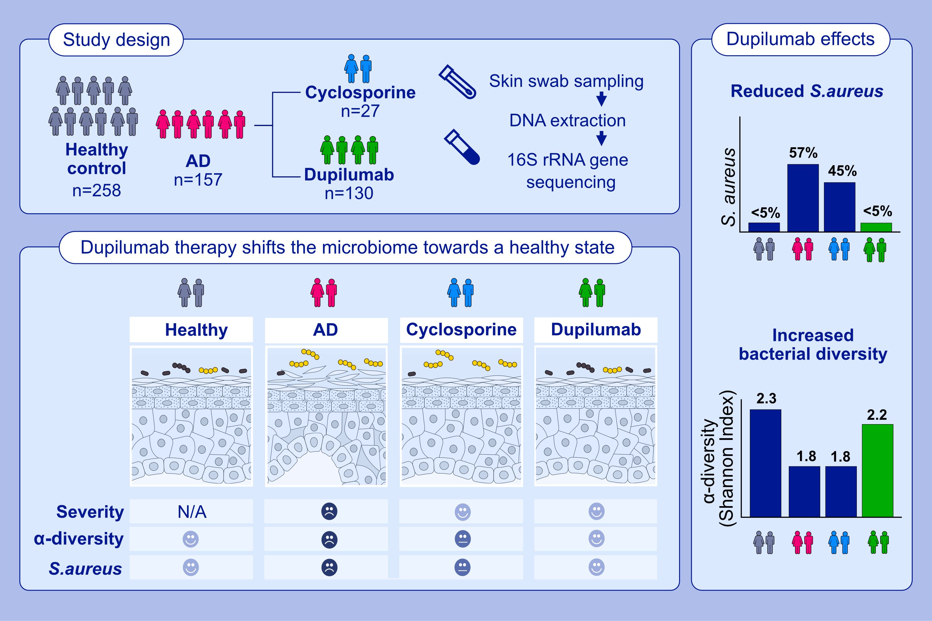 We found that individuals with AD under dupilumab treatment, independent of improved AD symptoms had decreased numbers of S. aureus, resulting in the skin microbiota being of similar composition to skin microbiota in individuals unaffected by AD. In contrast, ciclosporin treatment did not affect skin bacteria despite improvement in the symptoms of AD. Treatment with dupilumab but not cyclosporine seems to restore a healthy skin microbiota largely independent of improvement in AD symptoms indicating a treatment-specific effect of dupilumab on the skin microbiota.